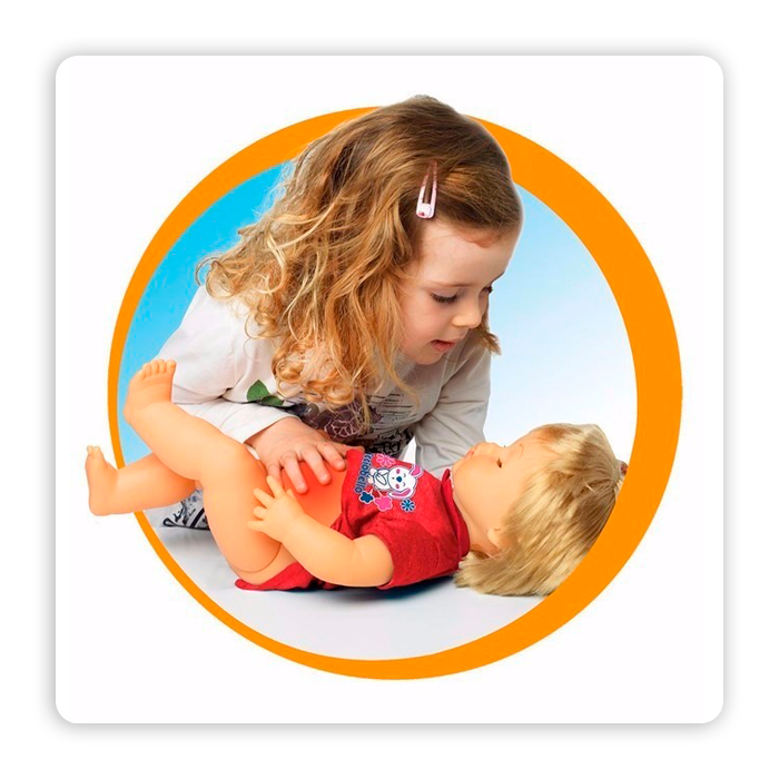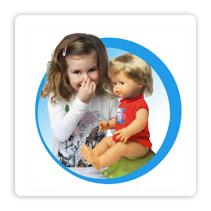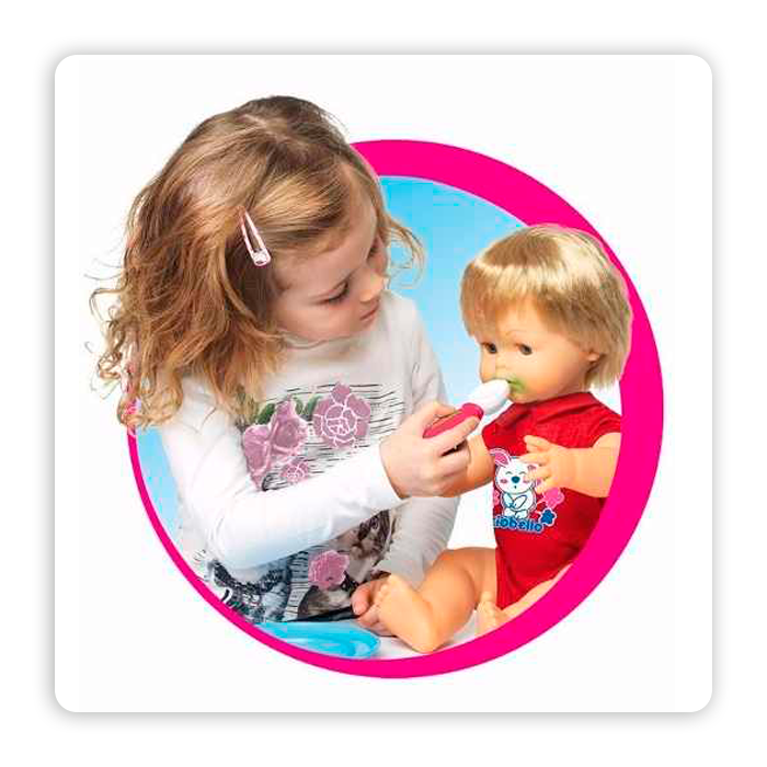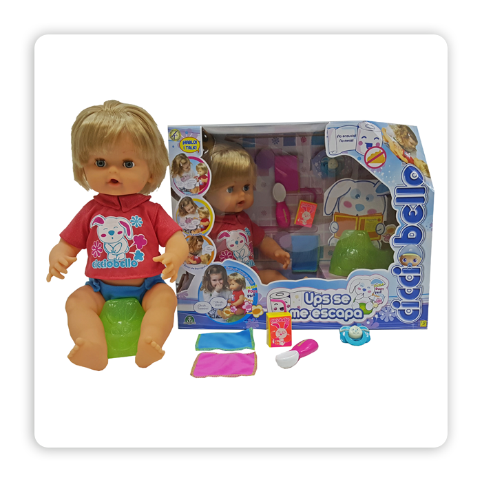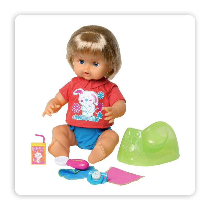 Diviértete jugando con Cicciobello como una mami de verdad. Reproduciendo los gestos típicos y situaciones de una mami y su bebé en la vida real: los primeros alimentos del bebé, el dolor de barriguita y enseñar a ir al baño. Cicciobello le pide a su mami comida o bebida y luego de la hora de la comida… Es hora de hacer popó! Hazle un masajito en la barriguita y escucha los graciosos sonidos, siéntalo en su bacenilla y mira lo que pasa!