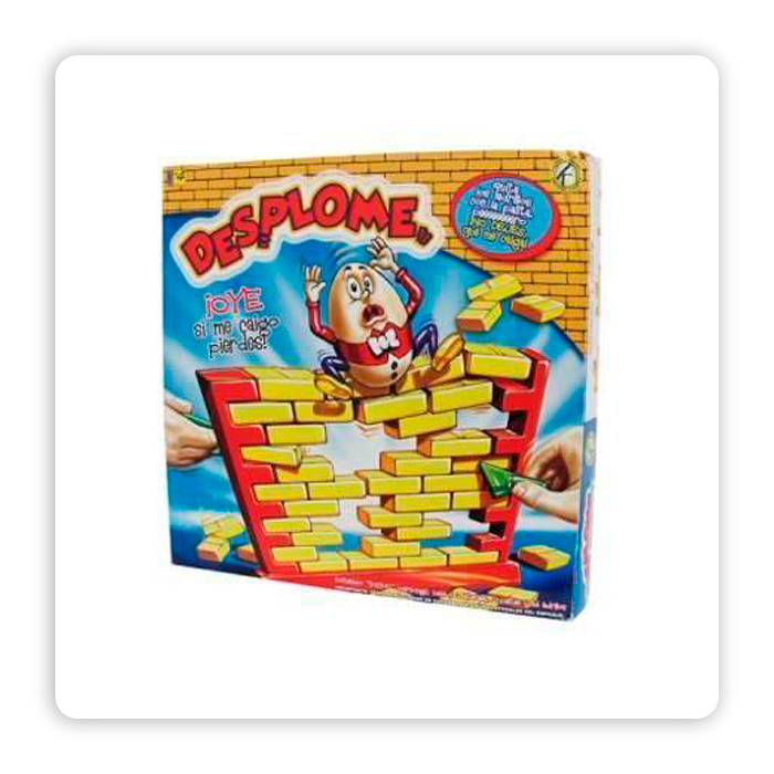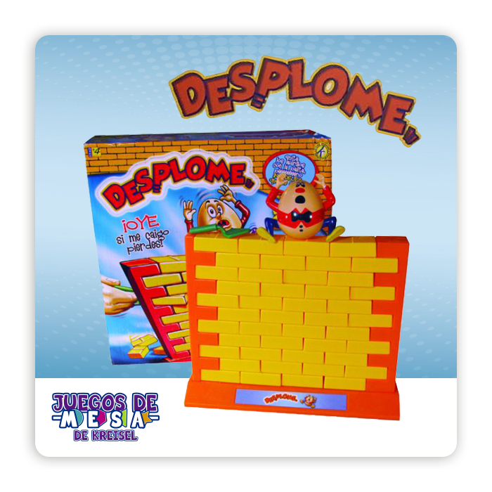 DESPLOME es un sencillo y divertido juego de mesa con la figura del conocido y simpático personaje de cuentos el huevito HUMPTY DUMPTY que desarrolla las habilidades y destrezas de los niños que, por turnos, deberán empujar los ladrillos fuera de base sin dejar que HUMPY DUMPTY se caiga de la pared. Pueden jugar 2 o más niños.