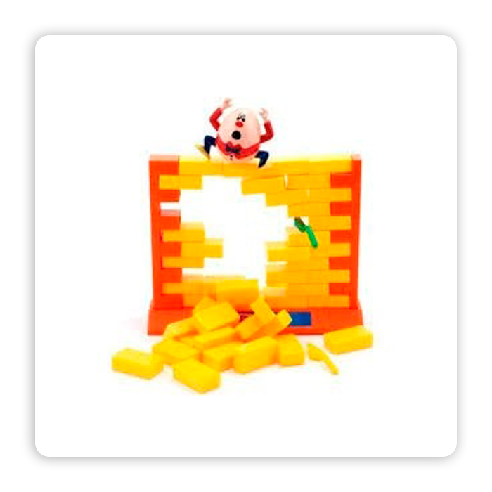 Incluye: 1 base, 4 ladrillos, 2 palas para tumbar los ladrillos, 1 huevito Humpty Dumpty