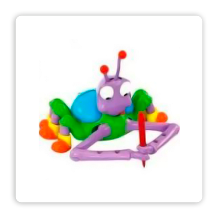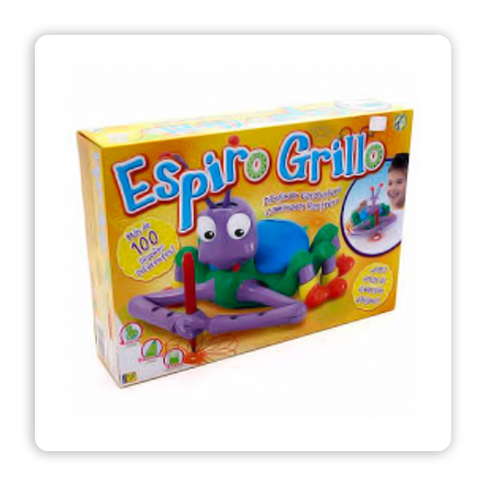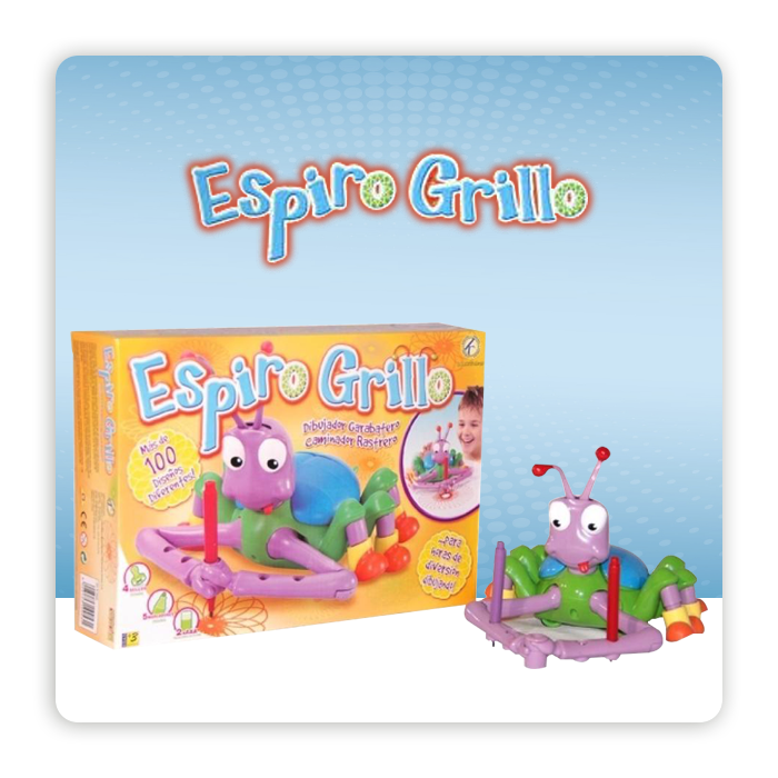 ESPIROGRILLO, dibujador en forma de grillo que al colocarle uno o varios marcadores de colores en los agujeros de sus brazos, realizada infinidad de dibujos espirográficos mientras se va moviendo (producto motorizado a baterías). El niño elige la posición, velocidad y tipo de trazo, obteniendo de esta manera un dibujo diferente e irrepetible. En sus patas trae sellos que puedes colocar alrededor del dibujo realizado y pintar con los marcadores. La idea es que el niño use su imaginación y obtendrá un sin número de diseños distintos mientras disfruta de los movimientos graciosos del grillo.